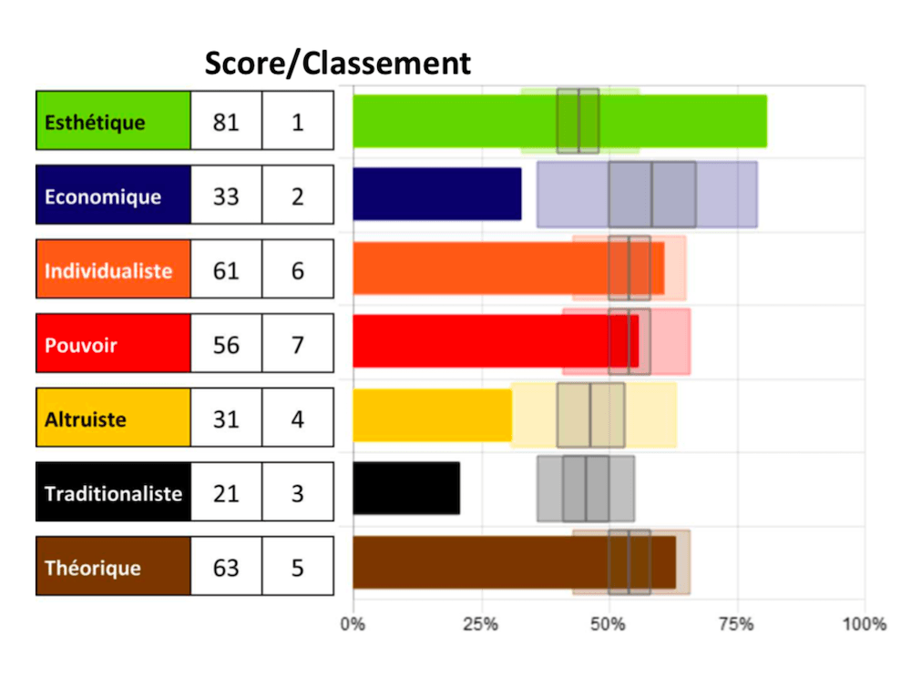 - Esthétique : c’est le besoin d’atteindre l’équilibre et le bien-être, en accordant plus d’importance à l’esthétique qu’à la pratique. Les personnes dont l’esthétique est une force motrice importante aiment les environnements favorisant la créativité.